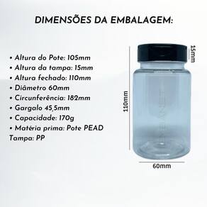 altura do pote: 105 mm altura da tampa: 15 mm altura com tampa fechado: 110 mm diâmetro 60 mm circunferência: 182 mm gargalo 45,5 mm capacidade: 170 g matéria prima: pet