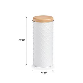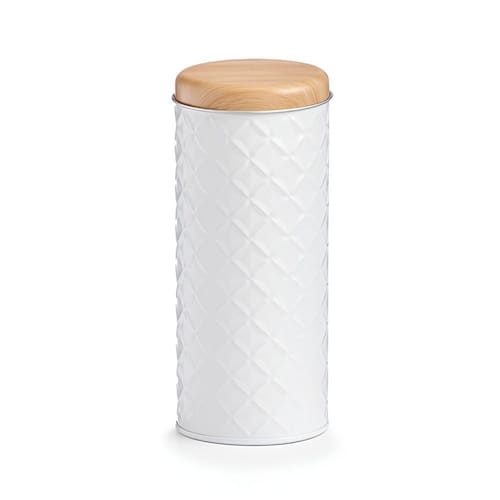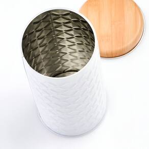 Modelo super ergonômico. O pote metálico branco é todo feito em metal, com a tampa lisa com estampa padrão madeira, e sua parte inferior tem bonito alto relevo geométrico que dá um efeito muito decorativo a peça. Sua tampa é bem ajustada, por isso permite melhor conservação dos mantimentos nele armazenados. Também vai muito bem como peça decorativa na prateleira da cozinha.