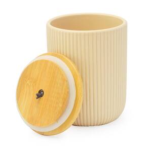 - dimensões 10 x 12,5 x 10 cm largura x altura x profundidade - composição: cerâmica e bambu - vedação na tampa com anel de silicone - modelo com relevo canelado