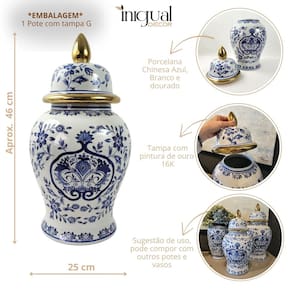 Pote Potiche Porcelana Azul E Branco Floral Decoração 46cm Potiche de Porcelana Azul e Branco com detalhes em Ouro 16K - Floral Inigual Decor Adicione um toque de grandiosidade e elegância clássica ao seu ambiente com o Potiche de Porcelana Azul e Branco Floral da Inigual Decor. Esta peça imponente é perfeita para quem busca um item decorativo que combine a tradição da porcelana com a beleza delicada de padrões florais. Habilmente trabalhado em porcelana de alta qualidade, este potiche apresenta um encantador padrão floral em tons de azul e branco, que evoca serenidade e sofisticação. Seu design imponente, com 46,0 cm de altura total e 30,0 cm sem a tampa , 25 cm de largura e profundidade, e uma boca com diâmetro de 12,5 cm, o torna ideal para ser o destaque em aparadores, mesas de centro ou consoles amplos. Com um peso de 3585g, ele possui uma presença substancial que reflete a qualidade do material e seu acabamento impecável. Use-o para guardar pequenos tesouros, ou simplesmente como uma peça decorativa central, que adiciona um toque de arte e requinte clássico ao seu lar. Por Que Escolher o Potiche Inigual Decor