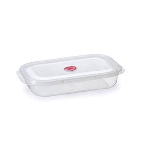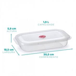 Pote raso com válvula para alimentos transparente 1,9 litros nitron Pote raso com valvula 1,9 lts Peso: 150 g Largura: 18,5 cm Comprimento: 30,5 cm Altura: 5,9 cm Capacidade: 1,9 litros