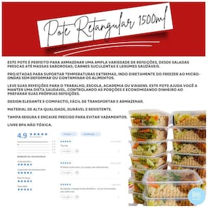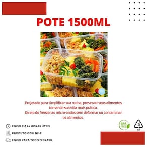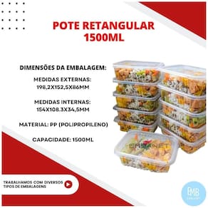 Na compra desse produto, você recebe 10 unidades de potes e 10 unidades de tampas. As medidas externas do pote são 198,2x152,5x86mm e as medidas internas são 154x108.3x34,5mm. O material utilizado é o polipropileno pp e a capacidade de cada pote é de 1500ml.