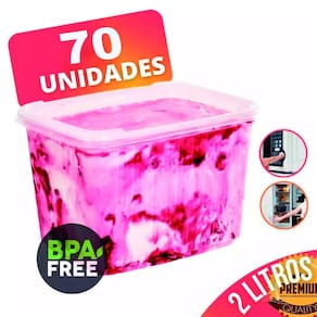 Com medidas de 11,5cm de altura, 19,5cm de comprimento e 13,5cm de largura, este pote é prático de usar e possui alça para facilitar o transporte. Sua embalagem contém 70 unidades, oferecendo um ótimo custo-benefício.