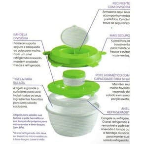 - Pote com 3 divisórias, porta temperos, placa térmica para manter frescos os alimentos.