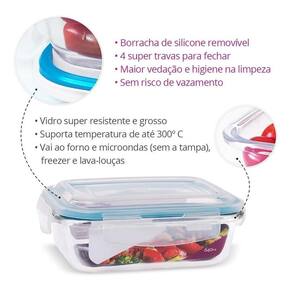 Esse pote de vidro temperado de 640ml hermético com super travas foi pensado especialmente para facilitar o seu dia a dia na cozinha e trazer mais sofisticação ao seu lar.Produzido em vidro temperado, pode ser levado ao:- forno micro-ondas.- freezer.- geladeira.- máquina de lavar louças.- à mesa.Os potes refratários de vidro hermético possuem tampas resistentes com fechamento 100% hermético, suportam temperaturas de até 300 e permitem uma limpeza fácil e mais rápida, deixando o pote mais higiênico, sem qualquer vestígio de cheiro ou sujeira.Pote de 640ml adequados às várias necessidades do dia a dia como guardar alimentos secos, frutas e até líquidos, molhos e sopas, pois o isolamento é garantido.Mantenha seus alimentos armazenados de forma adequada e segura com os potes de vidro hermético. Sua tampa permite um alto nível de vedação mantendo frescor, cor e sabor dos alimentos.Aliando qualidade, praticidade e preço justo, apresentamos o pote de vidro hermético. O pote ideal para o seu dia-a-dia.Diferenciais----- vai ao forno convencional sem a tampa , forno elétrico sem a tampa , microondas sem a tampa e freezer.- evita que o cheiro se espalhe devido a sua super vedação.- anel de silicone removível e lavável.- possui 4 super travas.- mantém os alimentos frescos por mais tempo.- suporta uma variação térmica de até 300c não é indicado dar choque térmico .- tampa livre de bpa bisfenol a , ou seja, não é tóxica.- fácil de limpar e higienizar, pois pode tirar o anel de silicone e vedação para limpeza.- sem risco de vazamento devido a sua super vedação.- super resistente, vidro temperado.Fique atento à imitações baratas, só os potes aliam qualidade com todos os diferenciais mencionados ; ideal para:----- utilizar como marmita no dia-a-dia.- armazenar os alimentos na geladeira.- servir à mesa com aperitivos.- aquecer os alimentos no micro-ondas.- guardar os alimento no freezer.- presentear a mãe ou a sogra...rs.Ficha técnica----modelo: pote de vidro retangularmaterial: vidro temperado borosilicato, tampa de plástico e anel vedação de siliconeitem incluso: 1 pote hermético com tampa modelo: pote de vidro retangulargarantia: 30 dias contra defeito de fabricaçãoNão realizar choque térmico tirar do forno ou local quente para local frio ou vice e versa medidas----capacidade - 640mlpeso - 495gcomprimento - 17cmlargura - 12cmaltura - 6cm