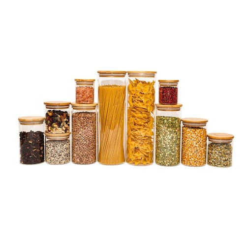 Esse é o Kit de potes de vidro hermético para mantimentos com tampa de bambu da OIKOS.