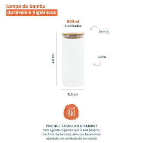 04 POTES DE VIDRO HERMÉTICO PARA MANTIMENTOS DE 800ML COM TAMPA DE BAMBU - OIKOS Altura: 20 cm Diâmetro: 8,5 cm