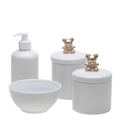 Para deixar seu bebê sempre cheirosinho este kit é perfeito Fabricados com materiais de altíssima qualidade e resistência, esse kit foi desenvolvido para facilitar o dia a dia das mamães, que precisam da praticidade de ter tudo devidamente armazenado e pronto para uso Dados TécnicosKit higiene com porcelanas brancas decoradas com ursinho dourado. Itens Inclusos no Kit01 Pote grande em porcelana branca com tampa01 Pote pequeno em porcelana branca com tampa 01 Molhadeira em porcelana branca01 Porta ÁlcoolGel/ Sabonete Líquido em porcelana branca MedidasPote Grande: 9 cm de diâmetro e 10 cm de alturaPote Pequeno: 9 cm de diâmetro e 8,5 cm de alturaMolhadeira: 11,5 cm de diâmetro e 5,5 cm de alturaPorta ÁlcoolGel/Sabonete Liquido: 6,5 cm de diâmetro e 15 cm de altura