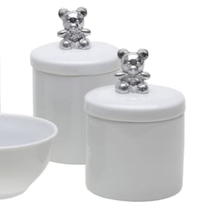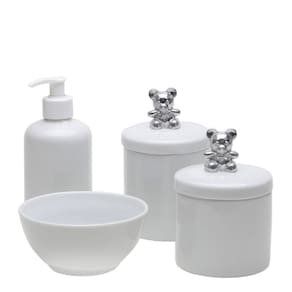 Para deixar seu bebê sempre cheirosinho este kit é perfeito Fabricados com materiais de altíssima qualidade e resistência, esse kit foi desenvolvido para facilitar o dia a dia das mamães, que precisam da praticidade de ter tudo devidamente armazenado e pronto para uso Dados Técnicos Kit higiene com porcelanas brancas decoradas com ursinho prata. Itens Inclusos no Kit 01 Pote grande em porcelana branca com tampa 01 Pote pequeno em porcelana branca com tampa 01 Molhadeira em porcelana branca 01 Porta ÁlcoolGel/ Sabonete Líquido em porcelana branca Medidas Pote Grande: 9 cm de diâmetro e 10 cm de altura Pote Pequeno: 9 cm de diâmetro e 8,5 cm de altura Molhadeira: 11,5 cm de diâmetro e 5,5 cm de altura Porta ÁlcoolGel/Sabonete Liquido: 6,5 cm de diâmetro e 15 cm de altura Ean: 7898659185543