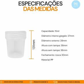 Dimensões do Pote: Altura com tampa: 38 mm Altura sem tampa: 36 mm Diâmetro da boca: 28 mm
