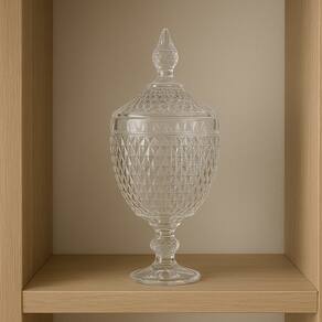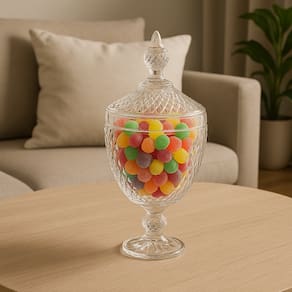 Sua tampa com pegador ornamentado e o formato em pedestal valorizam ainda mais o visual elegante da peça, podendo ser utilizado para armazenar doces, bombons ou simplesmente como item decorativo.
