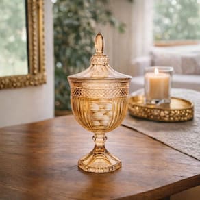 O Potiche de Vidro Âmbar com Tampa Small Piece 470ml é uma peça elegante e versátil, perfeita para quem deseja unir funcionalidade e sofisticação na decoração. Com seu tom âmbar moderno e acabamento refinado, ele valoriza qualquer ambiente, trazendo charme e personalidade à composição.