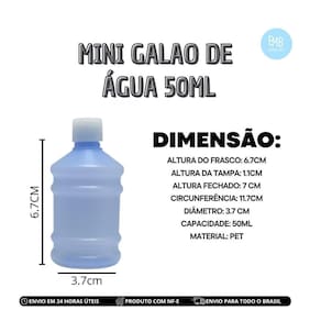 Especificações do Galão: Altura do frasco: 6,7 cm Altura da tampa: 1,1 cm Altura com tampa fechada: 7 cm Circunferência: 11,7 cm Diâmetro: 3,7 cm Capacidade: 50 ml