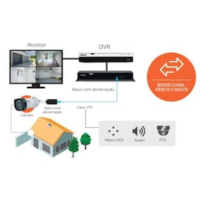 Transmissão de vídeo e dados por um único cabo. O sinal de dados permite acessar o Menu OSD das câmeras, áudio e controle de PTZ das speed domes.