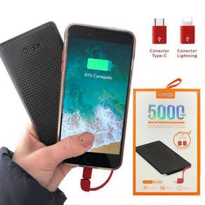 Possui design elegante e moderno, no formato slim, cabendo facilmente em bolsos e compartimentos pequenos. Usa bateria de polímero de lítio para torna-lo mais fino e de alta performance. construído em proteção da bateria IC para evitar o excesso de carga, sobre o descarregamento e curto-circuito. Possui cabo embutido e 2 adaptadores um type-c e outro lightning. Especificações:- Marca: Kaidi- Modelo: KD-952- Material: Plástico de alta qualidade- Produto: Power Bank- Bateria: Polímero de Litio- Capacidade: 5.000mah- Capacidade da Bateria Interna: 3.7v/5000mah 18.5wh- Entrada: Micro USB Dc 5v 2a- Saída Nominal: =3160mAh =15.8wh- Dupla Saída Usb: 5v 2.1a, 5v 2.1a- Saida: DC5V 2.1A (built in cable) / DC5V 2.1A (usb port)- Duração de Bateria em Standby: 5000h- Ciclo de Vida: 500 Recargas (1 Recarga = De 0 A 100)- Temperatura em Trabalho: 0C to 40C- Tempo Carregamento do Power Bank: 3-5 horas- Indicador de carga em LEDs.- Chip inteligente de reconhecimento, detecta automaticamente a tensão.- Tecnologia pass through charging, pode carregar seus dispositivos e ser recarregado ao mesmo tempo. Conteúdo da Embalagem:- Carregador Portatil Power Bank 5000mAH Kaidi KD-952 Original- Cabo micro USB (v8)- Adaptador Micro usb X Tipo C- Adaptador Micro usb X lightning Marca: Atacado25