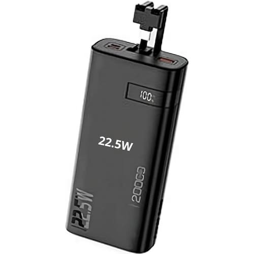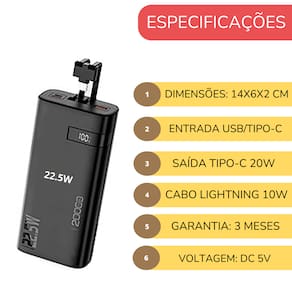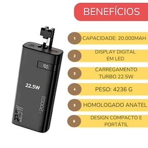 Carregador portátil com bateria de 20000mAh e função turbo para carregamento rápido.Acabamento do material