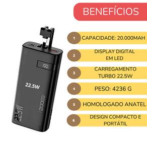 Características gerais do produto Carregador portátil cometros bateria de 20000metrosAh e função turbo para carregametrosento rápido.