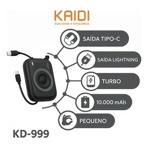 Power Bank compacto com design de minicâmera, 10000mAh de capacidade, carregamento rápido de até 22.5W, entrada Tipo-C, saídas Lightning e Tipo-C, proteção de múltiplos circuitos, visor LED indicador e construção em ABS + PC retardante de chamas.Tipo