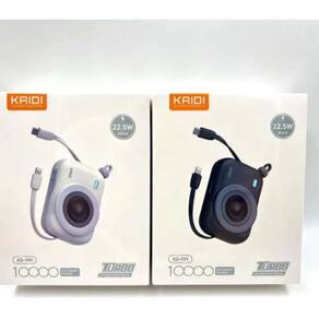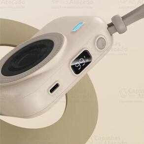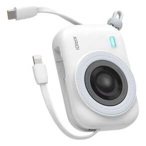 Power Bank compacto com design de minicâmera, 10000mAh de capacidade, carregamento rápido de até 22.5W, entrada Tipo-C, saídas Lightning e Tipo-C, proteção de múltiplos circuitos, visor LED indicador e construção em ABS + PC retardante de chamas.Tipo