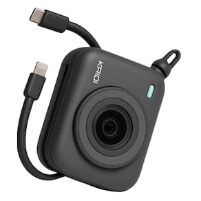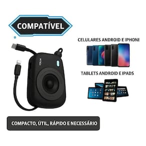 Power Bank compacto com design de minicâmera, 10000mAh de capacidade, carregamento rápido de até 22.5W, entrada Tipo-C, saídas Lightning e Tipo-C, carregamento por indução, visor LED indicador, proteção contra sobrecarga, descarga excessiva e curto-circuito.Tipo