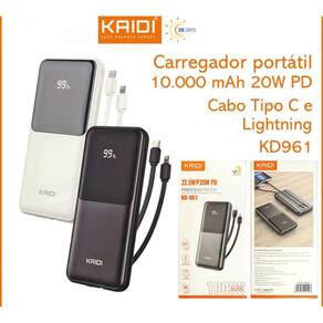 Power bank com capacidade de 10.000mAh, carregamento rápido PD de até 22.5W, dois cabos embutidos (Tipo-C e Lightning), visor digital LED, múltiplas entradas e saídas, design compacto e leve.Tipo