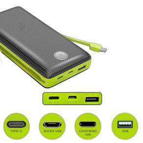 Power bank portátil 20000mah bateria rápida e duradoura Power bank 20.000mah com adaptador lightning / tipo c / micro usb - compatível com todos os modelos de celulares - indicador em led - 3 entrada - 1 saída usb. - compatível com qualquer telefone, tablet e qualquer dispositivo que use cabo usb para carregar basta conectar com o cabo usb, não é compativel com o novo cabo tipo c do ip-hone . - chip de reconhecimento inteligente de voltagem detecta automaticamente a voltagem. - construída em proteção de bateria ic para evitar o excesso de carga, descarga excessiva e curto-circuito. - peso líquido: 500g - tamanho: 1537728mm