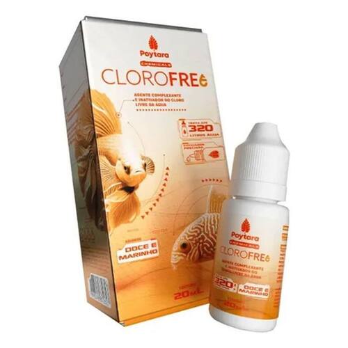 Atributos do Produto: Marca: Poytara Modelo: Clorofree 20ml Tipo de Pet: Peixes Tipo de Água: Doce e Salgada Volume Líq. Produto L : 0,02 Rendimento: 320 L Composiçãoformulação: Tiossulfato de sódio. Marca: Não Informado