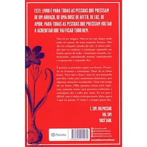"Este livro é para todas as pessoas que precisam de um abraço, de uma dose de afeto, de luz, de amor. Para todas as pessoas que precisam voltar a acreditar que vai ficar tudo bem. Não vai ter mágica. Não vai ter um clique onde tudo vai passar de uma maneira brusca. Não vão ter soluções caindo do céu. A única solução mágica que eu conheço é continuar seguindo em frente apesar de tudo. Continuar vivendo, enfrentando, caminhando mesmo cambaleando e tropeçando e sentindo dor. É preciso se permitir seguir em frente. Permitir-se levantar e continuar. Parar de se achar fraco. Você não é fraco, você só está passando por dias ruins, por momentos dolorosos, por algumas situações incômodas. Você está longe de ser fraco. Olhe quantas coisas você superou, quantas coisas você precisou enfrentar e conseguiu dar a volta por cima. Eu sei que é difícil, mas a única coisa que posso te dizer agora é que vai passar. O resto é o tempo quem diz. E, sim, vai passar. Vai, sim. Você sabe."