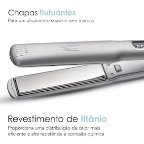 Benefícios: Bivolt Automático: Compatível com 127V e 220V Chapas Flutuantes: Alisamento suave e sem marcas Tecnologia MCH: Aquecimento ultrarrápido e temperatura estável Painel Digital: Visualização precisa da temperatura e aquecimento Trava de Segurança: Facilita o transporte e protege contra impactos Chapas de Titânio: Calor uniforme, resistência à corrosão e brilho intenso Controle de Temperatura: De 120°C a 250°C, ideal para todos os tipos de cabelo