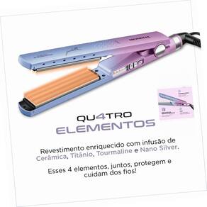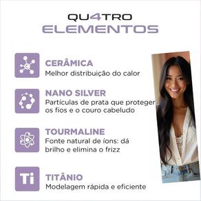 Seu | revestimento especial | com Qu4tro Elementos — Cerâmica, Titânio, Tourmaline e Nano Silver — é um verdadeiro diferencial. A cerâmica garante uma distribuição uniforme do calor, enquanto o titânio ajuda a reduzir o tempo de secagem e elimina o frizz. A tourmaline, com seus íons negativos, traz um brilho intenso e a proteção das partículas de Nano Silver inibe a ação de bactérias, garantindo um cuidado extra com os fios e couro cabeludo.