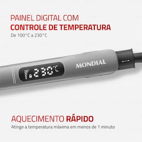 PAINEL DIGITAL COM CONTROLE DE TEMPERATURA: Ajuste preciso de 100°C a 230°C para atender às necessidades de cada tipo de cabelo.