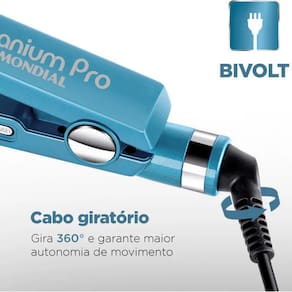 Descrição do produto Resultado de salão em casa! A Titanium Pro P-28 possui chapas de titânio, que possuem superfícies ultralisas e promovem um alisamento perfeito, com mais brilho e sem frizz. Além disso, como a prancha tem desempenho profissional, as chapas são resistente à corrosão química. Ela também é bivolt e tem cabo giratório 360°. Saiba mais sobre a Prancha para cabelos da Mondial: