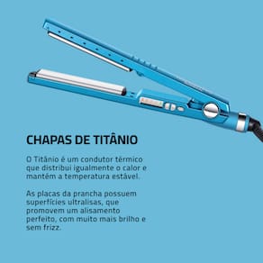 CHAPAS DE TITÂNIO: O Titânio é um condutor térmico que distribui igualmente o calor e mantém a temperatura estável. As placas da prancha possuem superfícies ultralisas, que promovem um alisamento perfeito, com muito mais brilho e sem frizz.
