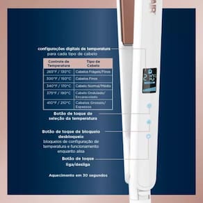 com 5 configurações de calor (210C, 190C, 170C, 150C, 130C). Escolha a temperatura ideal para o seu tipo de cabelo e