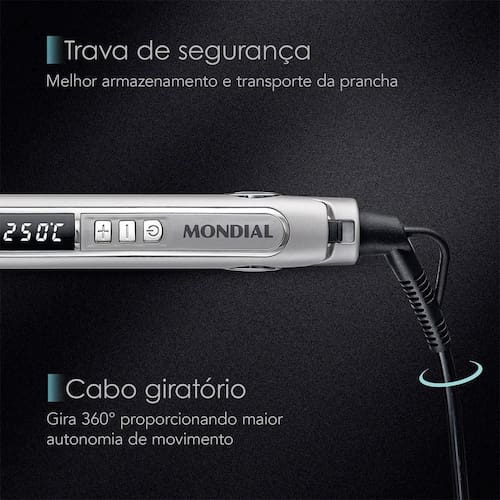 Com temperatura máxima de 250°C, a prancha Mondial entrega performance profissional, ideal para procedimentos químicos e alisamentos mais intensos. Esse nível de calor proporciona mais eficiência, rapidez e um acabamento impecável, com efeito espelhado e fios visivelmente mais lisos.