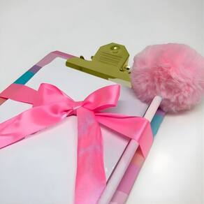 Prancheta com Bloco de Notas e Caneta Cristal com Pompom Rosa Papelaria | Fofo | Escrita