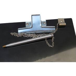 Prancheta tamanho ofício com prendedor metálico para facilitar na escrita e dar melhor acabamento ao seu trabalho.Especificação PranchetaMaterial: AcrílicoTamanho: OfícioPrendedor: MetálicoCor: Transparente ou Fumê (conforme disponível para seleção no momento da compra)Dimensões: 32 cm (comprimento) x 23 cm (largura)Especificação CanetasMaterial da base: chapa de ferro pintada ou cromadaCorrente de ferro dupla com banho de cromoTubo para caneta em alumínio polidoCor disponível da base da caneta: PrataComprimento da corrente: 50 cmTinta: AzulRefil: Compatível com refil de caneta BIC cristalINFORMAÇÕES IMPORTANTES:- A(s) cor (es) dos produtos podem sofrer variação de tonalidade, de acordo com a configuração do seu dispositivo ou monitor. - O prazo de entrega informado no anúncio é apenas uma previsão, podendo sofrer alterações na data de entrega informada no ato da compra por motivo de força maior.