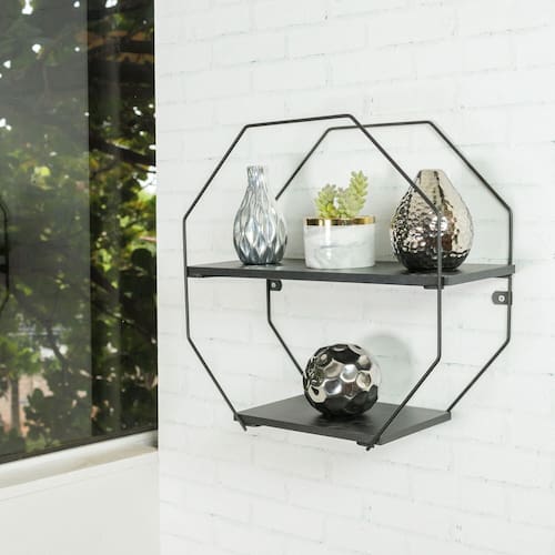 Prateleira Decorativa Octogonal com estrutura em aço e pintura eletrostática e prateleira de madeira MDP multifuncional para sala de estar, sala de jantar, quarto, cozinha e qualquer ambiente, ideal para organização e decoração da casa. Organize todos os ambientes. Acabamento: Pintura Ambiente Principal: Sala de Estar Complexidade da Montagem: Baixa: pode ser montado por uma pessoa sozinha Cor: Preto Cor do Produto: Preto Escala de Brilho: Fosco Itens Inclusos: 1 Prateleira e Manual de Montagem Manual de Montagem e Instalação: https://product-hub-prd.madeiramadeira.com.br/938782/documents/d0598e22-02dc-4857-b8d1-9cd653cd64d92305816547817255561966556.pdf Material Principal: Aço Necessita Montagem: Sim Peso: 0,81 kg Peso Máximo por Prateleira: 2 kg Possui Espelho: Não Possui Quantidade de Prateleiras: 02 Recomendações de Uso, Manutenção e Limpeza: Recomendável instalação em parede de alvenaria. Para limpeza, utilize sabão ou detergente neutro e esponja macia. Nunca use solventes, objetos cortantes ou abrasivos. Sistema de Montagem: Parafuso cabeça chata Phillips Ø4,0x40mm, Parafuso cabeça panela Phillips Ø3,5x9,5mm, Bucha expansiva S6mm Suporta Até (kg): 4 kg
