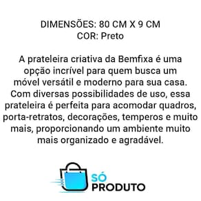 Dimensões: 80 cm x 9 cm Cor: preta A prateleira criativa da bemfixa é uma opção incrível para quem busca um móvel versátil e moderno para sua casa. Com diversas possibilidades de uso, essa prateleira é perfeita para acomodar quadros, porta-retratos, decorações, temperos e muito mais, proporcionando um ambiente muito mais organizado e agradável. Feita com materiais de primeira qualidade, a prateleira criativa da bemfixa é resistente e durável, oferecendo maior segurança e confiabilidade para os seus objetos pessoais. Além disso, seu design elegante e sofisticado complementa qualquer estilo de decoração, tornando-a uma ótima escolha para aprimorar a beleza de qualquer ambiente. A versatilidade dessa prateleira é um dos seus principais diferenciais, permitindo que ela seja utilizada em diferentes cômodos da casa, desde a cozinha até o quarto ou sala de estar. Seja para organizar livros, plantas, temperos ou objetos decorativos, essa prateleira criativa é a solução perfeita para quem busca um móvel multifuncional e prático. A bemfixa é conhecida por seus produtos de alta qualidade, e a prateleira criativa não é exceção. Seus materiais são selecionados cuidadosamente para garantir a maior resistência e durabilidade possível, proporcionando uma excelente relação custo-benefício para o consumidor. Com a prateleira criativa da bemfixa, você terá um móvel bonito, funcional e resistente para tornar sua casa ainda mais acolhedora e agradável. Seja para uso pessoal ou profissional, essa prateleira é a escolha perfeita para quem busca qualidade, beleza e versatilidade em um só produto. As imagens são meramente ilustrativas