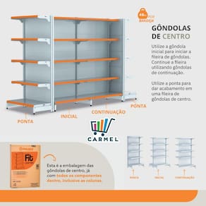 A fileira de Gôndolas deve ser iniciada com a Gôndola Inicial que possui 2 colunas.Todos os produtos Amapá possuem qualidade, resistência e durabilidade garantidas pelo uso de matérias-primas de alto padrão, processos produtivos tecnológicos e controle de qualidade. A pintura dos produtos é feita por meio da técnica eletrostática e com tratamento anticorrosão, deixandouniforme e resistente.