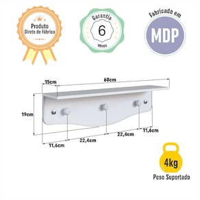 A Prateleira Infantil com Cabideiro Linha Encanto da Completa Móveis é versátil, prática e elegante, com características que a destacam. Ideal para o quarto do seu bebê, podendo decorar e organizar objetos ou decorações. Possui 3 cabideiros para que possa pendurar alguns casaquinhos ou roupinhas do seu pequeno! Necessita fixação na parede. O produto é entregue desmontado. Acabamento: Finish Foil Acompanha Suporte para Fixação/Trilho: Não Ambiente Principal: Quarto Infantil Complexidade da Montagem: Baixa: pode ser montado por uma pessoa sozinha Cor: Branco Cor do Produto: Branco Escala de Brilho: Fosco Itens Inclusos: 1 Prateleira, 1 kit Ferragem +1 Manual de Montagem Linha ou Coleção: Encanto Manual de Montagem e Instalação: https://product-hub-prd.madeiramadeira.com.br/975276/documents/2ada4453-2bfb-486d-b239-58980ceec91e2643585522917375413777094.pdf Marca: Completa Móveis Material Principal: MDP Necessita Montagem: Sim Origem do Produto: Nacional Peso: 2,2 kg Peso Máximo por Prateleira: 4 kg Possui Espelho: Não Possui Quantidade de Prateleiras: 01 Recomendações de Uso, Manutenção e Limpeza: Use um pano levemente umedecido com água, seguido de pano seco. Não utilize produtos químicos ou abrasivos. Sistema de Montagem: Sistema de montagem via parafusos. Suporta Até (kg): 4 kg