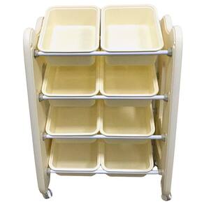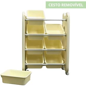 A Prateleira Organizadora De Brinquedos com Rodinhas é uma estrutura utilizada para manter todos esses itens em único lugar. Após a brincadeira, as crianças devem colocá-los nesse local, para evitar perder e deixar espalhado pela casa, possuindo 8 cestos grandes removíveis, modelo simples e de fácil acesso, facilitando a limpeza e organização.