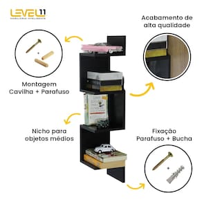 Marca: LEVEL11 Material: MDP Largura: 20 cm (ou 400 mm) Profundidade: 20 cm (ou 200 mm) Altura: 86 cm (ou 860 mm) Espessura: 1,5 cm (ou 15 mm) Peso Suportado (Por Prateleira): 05 kg Tempo de Montagem: 10 minutos
