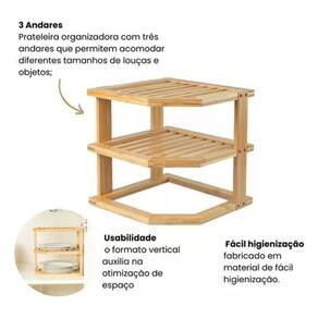 - organizador de prateleira: prateleira organizadora com três andares que permitem acomodar diferentes tamanhos de louças e objetos; - usabilidade: o formato vertical auxilia na otimização de espaço; - feita de bambu: material leve e ecologicamente correto. - fácil higienização: fabricado em material de fácil higienização.