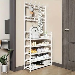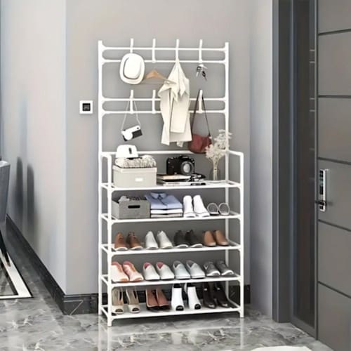 Com 5 prateleiras alturas e ganchos, ela oferece espaço para calçados, roupas e acessórios.