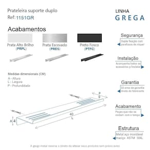 A prateleira suporte duplo da linha Grega possui um design moderno e sofisticado, é uma peça que se destaca com requinte. Ela decora e adiciona personalidade. Podem ser utilizadas em banheiros, decoração de parede, cozinhas, quartos e muito mais. Aproveita o espaço vertical das paredes liberando espaço no chão, assim criando a sensação de um ambiente maior. São peças que fazem realçar qualquer objeto, foi criada Em aço inox com uma qualidade que abrange áreas litorâneas, e possui a de um acabamento muito resistente. Agora é só você adquirir este lindo acessório e fazer o seu projeto se tornar realidade com um banheiro prático para toda a sua família. Características Fabricado em metal aço inox. Disponível no Prata Alto Brilho, Escovado e Preto Fosco. Pode ser instalado em parede, azulejo e porcelanato. Benefícios Fixação prática e segura com parafusos e buchas inclusos. O produto não possui nenhum detalhe em plástico ABS . Fácil higienização, ideal para locais que exigem limpeza constante. Aproveitamento inteligente do espaço, ideal para ambientes compactos. Resistente à corrosão e luz solar. Itens ENVIADOS: 1 prateleira suporte duplo 40cm, kit de parafusos e manual de instrução e instalação. Instalação INTELIGENTE Ao 1º furo, use uma broca medida menor, após use a medida correta e finalize, vai ajudar na precisão da fixação da bucha principalmente em azulejos e porcelanato.