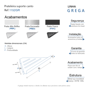 A prateleira suporte canto da linha Grega possui um design moderno e sofisticado, é uma peça que se destaca com requinte.