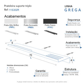 ITENS ENVIADOS: 1 prateleira suporte triplo 70cm, kit de parafusos e manual instrução instalação.