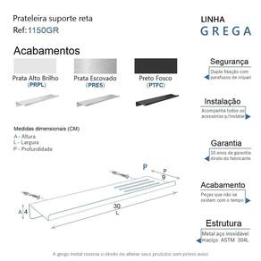 A prateleira suporte reta da linha Grega possui um design moderno e sofisticado, é uma peça que se destaca com requinte. Ela decora e adiciona personalidade. Podem ser utilizadas em banheiros, decoração de parede, cozinhas, quartos e muito mais. Aproveita o espaço vertical das paredes liberando espaço no chão, assim criando a sensação de um ambiente maior. São peças que fazem realçar qualquer objeto, foi criada Em aço inox com uma qualidade que abrange áreas litorâneas, e possui a de um acabamento muito resistente. Agora é só você adquirir este lindo acessório e fazer o seu projeto se tornar realidade com um banheiro prático para toda a sua família. Características Fabricado em metal aço inox. Disponível no Prata Alto Brilho, Escovado e Preto Fosco. Pode ser instalado em parede, azulejo e porcelanato. Benefícios Fixação prática e segura com parafusos e buchas inclusos. O produto não possui nenhum detalhe em plástico ABS . Fácil higienização, ideal para locais que exigem limpeza constante. Aproveitamento inteligente do espaço, ideal para ambientes compactos. Resistente à corrosão e luz solar. Itens ENVIADOS: 1 prateleira suporte reta 30cm, kit de parafusos e manual instrução instalação. Instalação INTELIGENTE Ao 1º furo, use uma broca medida menor, após use a medida correta e finalize, vai ajudar na precisão da fixação da bucha principalmente em azulejos e porcelanato. Marca: Não Informado Ean: 7908165322902