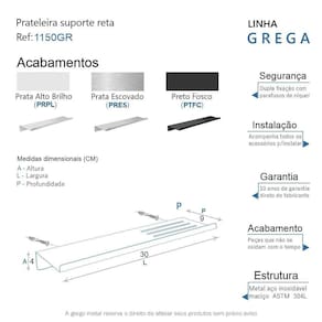 A prateleira suporte reta da linha Grega possui um design moderno e sofisticado, é uma peça que se destaca com requinte. Ela decora e adiciona personalidade. Podem ser utilizadas em banheiros, decoração de parede, cozinhas, quartos e muito mais. Aproveita o espaço vertical das paredes liberando espaço no chão, assim criando a sensação de um ambiente maior. São peças que fazem realçar qualquer objeto, foi criada Em aço inox com uma qualidade que abrange áreas litorâneas, e possui a de um acabamento muito resistente. Agora é só você adquirir este lindo acessório e fazer o seu projeto se tornar realidade com um banheiro prático para toda a sua família. Características Fabricado em metal aço inox. Disponível no Prata Alto Brilho, Escovado e Preto Fosco. Pode ser instalado em parede, azulejo e porcelanato. Benefícios Fixação prática e segura com parafusos e buchas inclusos. O produto não possui nenhum detalhe em plástico ABS . Fácil higienização, ideal para locais que exigem limpeza constante. Aproveitamento inteligente do espaço, ideal para ambientes compactos. Resistente à corrosão e luz solar. Itens ENVIADOS: 1 prateleira suporte reta 30cm, kit de parafusos e manual instrução instalação. Instalação INTELIGENTE Ao 1º furo, use uma broca medida menor, após use a medida correta e finalize, vai ajudar na precisão da fixação da bucha principalmente em azulejos e porcelanato.